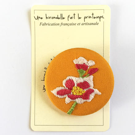 Jolie fleur Description du bijou Badge délicatement brodé par " Une Hirondelle fait le printemps" Détail Coton, fils à broder, métal argenté Diamètre : 4 cm 14 € Type de produit: Broches