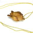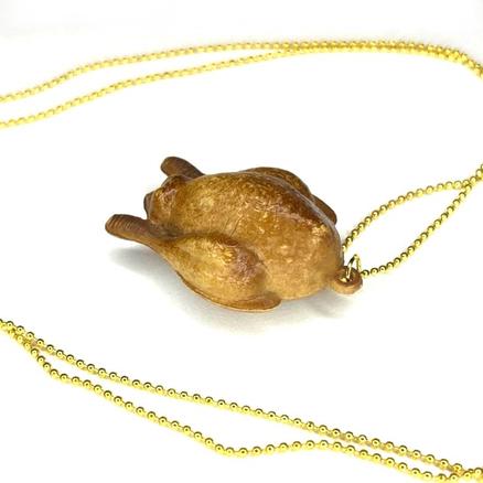 Rôti ! Visuel gastronomique Goûter salé, toujours contre son coeur Ingrédients Métal doré, poulet upcyclé Longueur : 55 cm 20 € Type de produit: Colliers