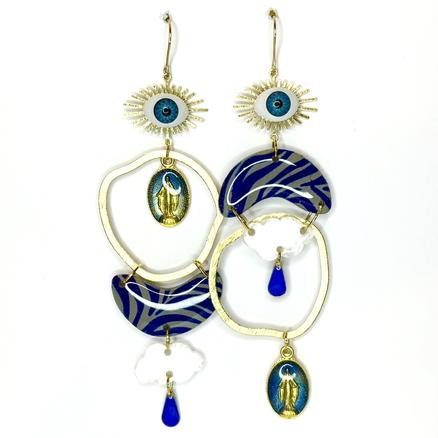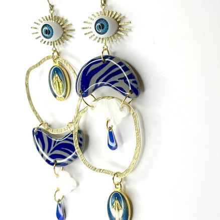 Métal doré, résine, pâte polymère, médailles upcyclées, yeux upcyclés, laiton, peinture métl, acétate