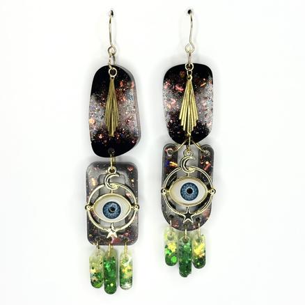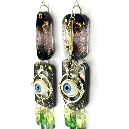 New ! Regard perché Ce que je vois Pour celles qui voient par delà les étoiles Ce que je crois Acier inoxydable, résine, yeux upcyclés, paillettes, métal doré Longueur : 7 cm 55 € Type de produit: Boucles d'oreilles