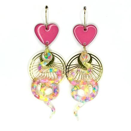 Festif Attirance physique Pour les langues de vipères, qui chient sur l'amour Dans le coeur Acier inoxydable, métal doré, peinture métal, résine, paillettes Longueur : 8 cm 45 € Type de produit: Boucles d'oreilles