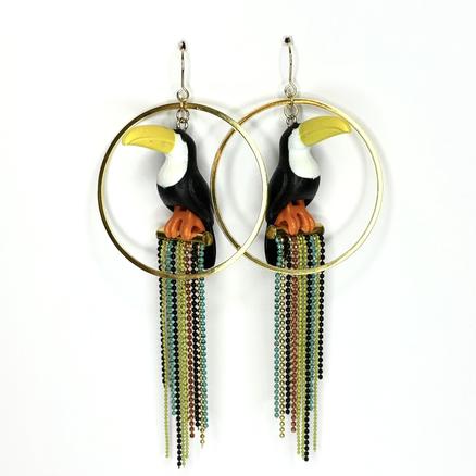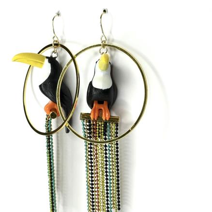 Joli ramphastidé Jungle Pour celles qui les ont déjà entendu chanter ( cakcakcakcakcaaaak ) Fever Acier inoxydable, résine, jouet upcyclé, métal doré, chaîne bille Longueur : 7 cm 49 € Type de produit: Boucles d'oreilles