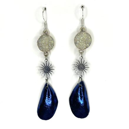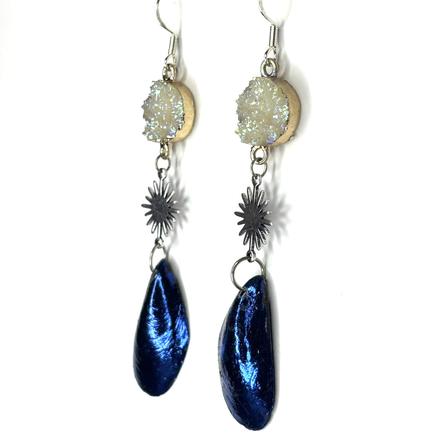 Cosmic mussel Front de mer Pour celles qui détestent les fruits de mer Dans l'huître Acier inoxydable, coquille de moule, résine, pigment, feuille de cuivre Longueur : 6 cm 38 € Type de produit: Boucles d'oreilles
