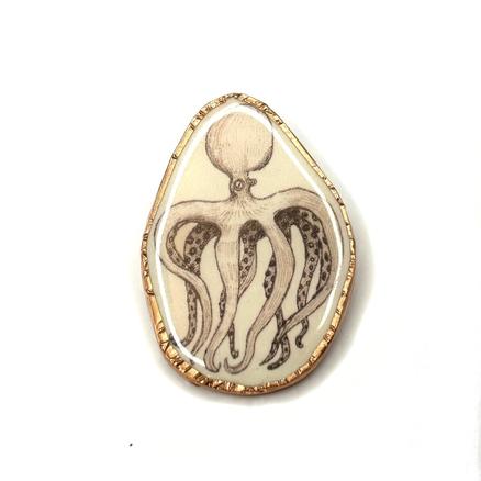 Parler oiseau Poésie Pour celles qui n'ont pas peur des tentacules Sous le verre Métal doré, résine, pâte polymère Hauteur : 5 cm 28 € Type de produit: Broches